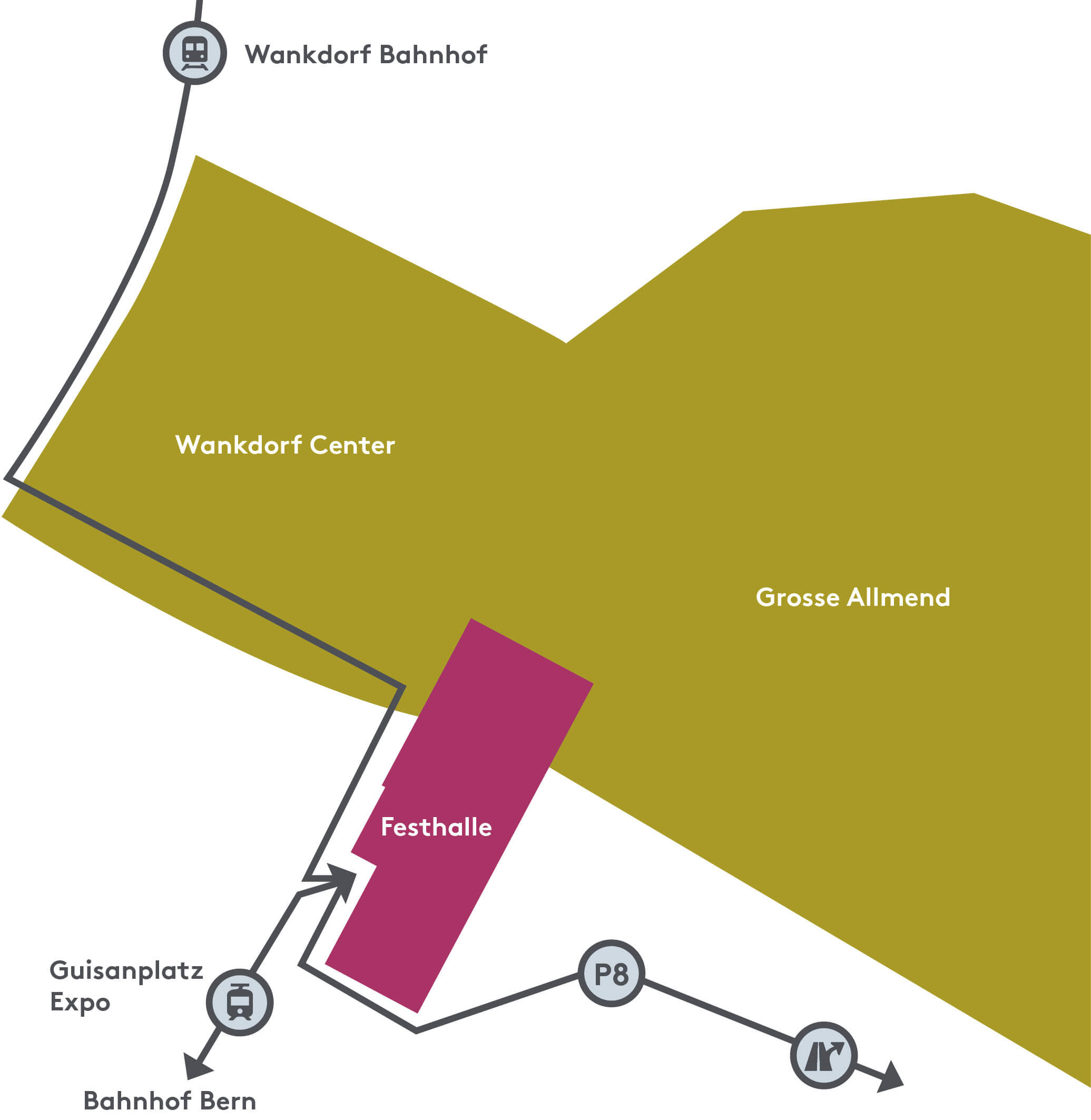 L’area BERNEXPO si trova lungo l’autostrada A1/A6/A12. Prendere l’uscita «Wankdorf» e seguire le indicazioni «BERNEXPO»/«expo».